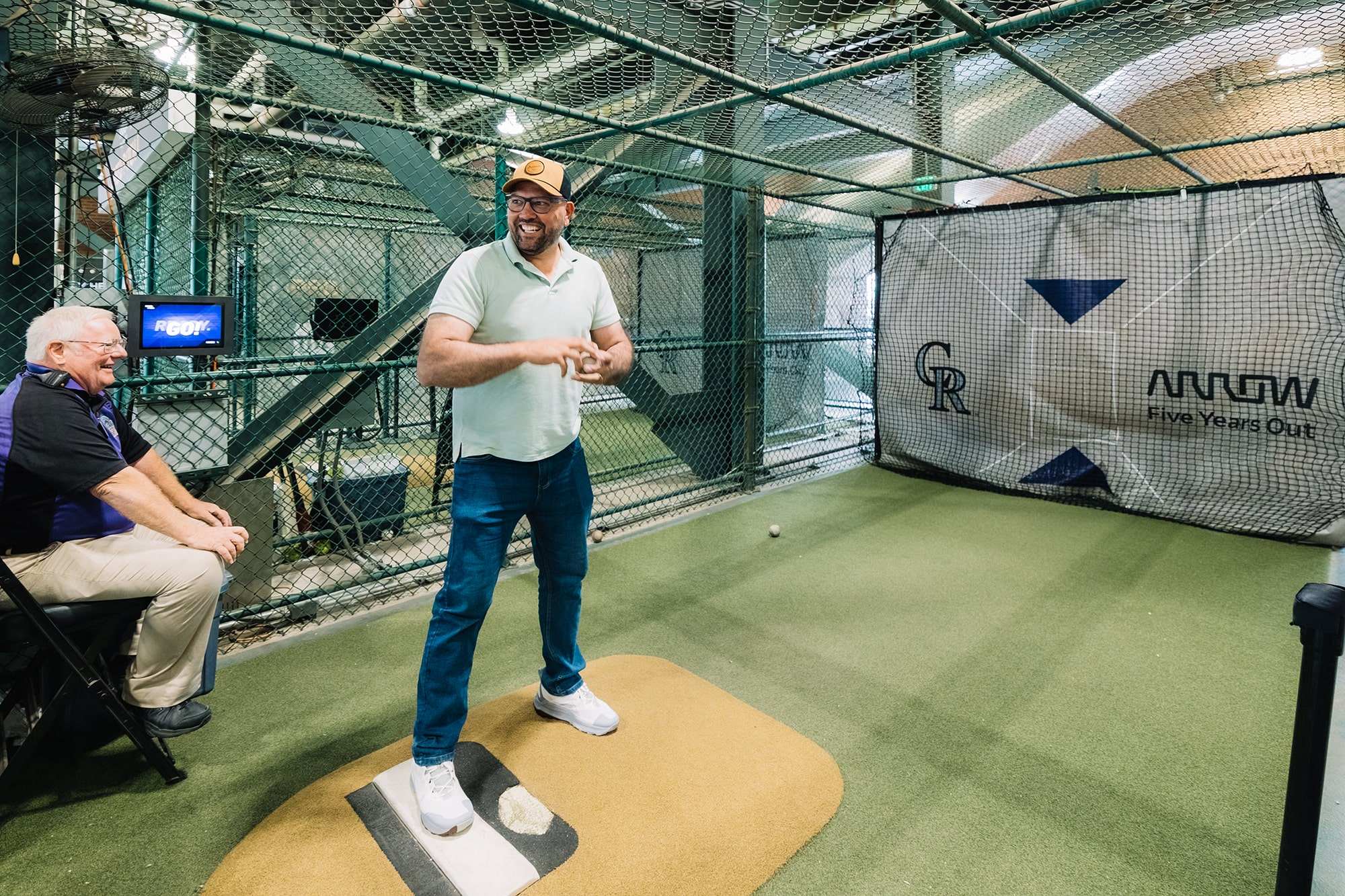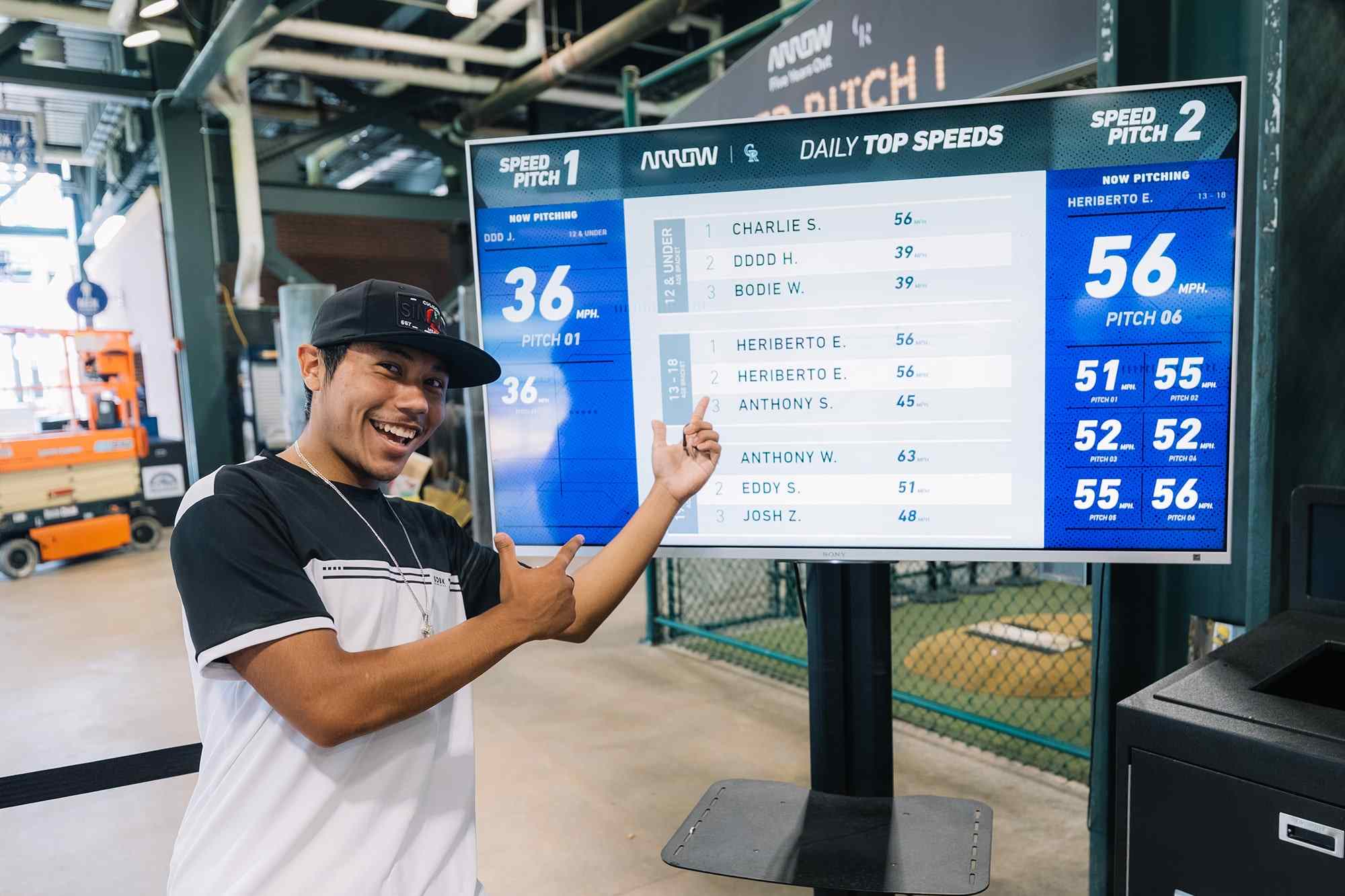 Man pointing at the speed pitch scoreboard during the Brannan Companies Picnic 2025 in Colorado